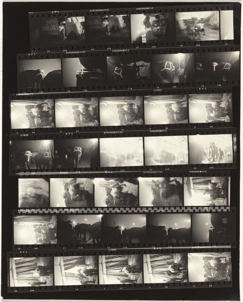 Editor: This is Robert Frank’s "Family and Uribe—Tappan, New York no number," a contact print from 1954. The work’s high contrast and sequential images, presented as a film strip, give the whole piece an experimental feeling. What visual elements stand out to you? Curator: The immediate impression is the inherent structure—the grid. The black borders delineating each frame act as a visual anchor. These boundaries highlight the shifting perspectives and juxtapositions that define Frank's style. We must also address tonality: what does the strong contrast communicate? Editor: The sharp contrast definitely draws my eye. It seems to flatten the images, emphasizing surface and texture over depth. Curator: Precisely. The compression you observe prompts reflection upon the essence of photographic representation itself. What is it capturing, and how is it doing so? The high contrast paired with the sequenced film strip form also accentuates a raw, unfiltered approach, doesn’t it? Editor: Yes, it feels very immediate, like snippets of a lived moment strung together. It makes me consider the act of image-making. How do these formal elements create the meaning? Curator: Consider the strategic framing. Note the fragmented narratives created through shifting perspectives in each shot. Does the lack of a definitive, singular image add to or detract from the work's message? It’s the disruption, the discontinuity that demands closer consideration. Editor: The sequential images almost make it feel performative, rather than strictly documentary. Each image offers another way of seeing. I see the form mirroring the fleeting nature of observation itself. Curator: I agree. Thinking through this from a Formalist perspective offers a deeper appreciation for Frank’s unique artistic sensibility and his critical commentary on photographic representation. Editor: Examining Frank’s technique truly opened my eyes to new interpretive possibilities! Curator: Mine too!