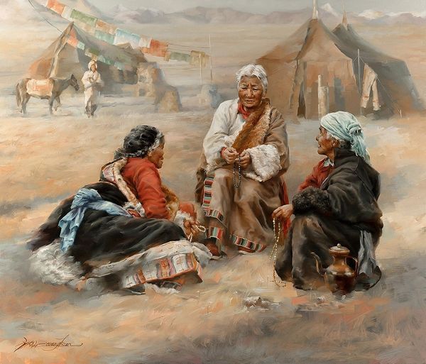 Editor: Here we have Nasreddine Dinet's "Martyr of Love," painted in 1922. It's an oil painting depicting a group of people surrounding a man who appears to be in distress. I’m immediately struck by how theatrical the scene is, almost staged. What is your take on this work? Curator: The “Martyr of Love” offers us a potent glimpse into Orientalist fantasies, particularly the intersection of desire, death, and idealized Arab culture. The image, ostensibly about grief, actually functions as a carefully constructed narrative intended for a Western audience. Editor: So, it’s not just about love and loss? Curator: Precisely. Consider who had the power to represent whom at the time. Dinet, as a French artist painting North Africa, participates in a colonial gaze. The "martyr" figure and the sorrowing women around him cater to Western expectations of exoticism and emotional excess. What do you make of their attire? Editor: The clothing is very detailed. The fabrics, the jewelry. It’s quite luxurious and maybe adds to this sense of "exoticism.” Curator: Exactly! This meticulous rendering invites viewers to consume a romanticized, static vision of Arab identity, conveniently obscuring the socio-political realities of French colonialism. Are we invited to truly empathize with this man or merely admire a spectacle of grief? Who benefits from this depiction? Editor: It definitely gives me something to think about, looking beyond the immediate emotions to understand the bigger picture. Curator: Indeed. Examining such works allows us to critically analyze the historical power dynamics embedded within artistic representation, pushing us to ask vital questions about cultural appropriation and the politics of looking.