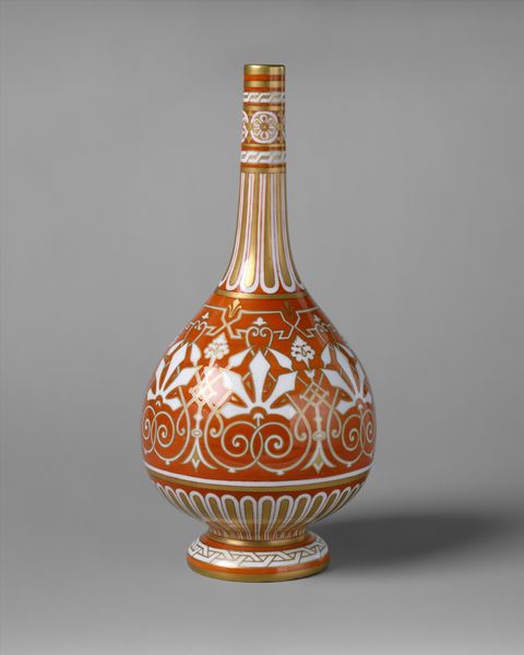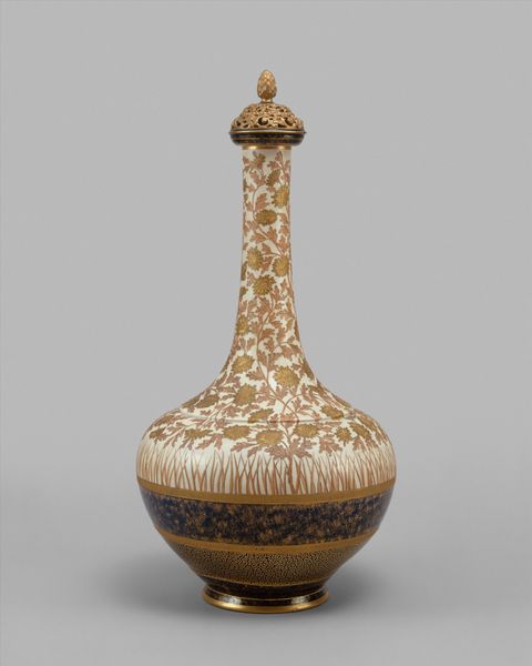 Curator: Allow me to draw your attention to this Covered Vase, crafted between 1886 and 1890 by the Faience Manufacturing Company. It’s a fascinating example of American art pottery, currently residing at the Metropolitan Museum of Art. Editor: Immediately, I see the drooping wisteria, that muted palette… it evokes a very specific kind of late Victorian melancholy, doesn’t it? Curator: Absolutely. The delicate earthenware, ornamented with art nouveau botanical motifs, is quite representative of the decorative arts movement of the period. Notice the techniques employed: hand-painted details combined with molded forms suggesting a level of craft production seeking artistic merit. The textures alone point towards a democratization of beauty. Editor: And those drooping wisteria blossoms - their violet hues symbolize both romance and regret, don't they? Their very form suggests a downward pull, almost like tears. The addition of the gold trim speaks to wealth but the porcelain itself seems aged or perhaps even unwell...a fascinating use of colour to enhance an emotionally powerful response. Curator: Indeed, it is the play between industry and artistry that is the most intriguing aspect of this particular object. Consider the manufacturing company, employing artists within its workshops, to create these ‘luxury’ items for a rising middle class seeking the aura of the artisanal. Each ceramic vessel represents both an object and the labour and ambition needed to form and adorn such pieces. Editor: Don't you think the vase form, capped with that almost architectural finial, hints at a ritualistic purpose beyond mere decoration? Like some forgotten fertility symbol perhaps... and the careful symmetry in its application points directly to established iconography with cross-cultural interpretations, or meanings layered over generations through recontextualized symbolism. Curator: Perhaps so. The confluence of decorative intent, mass production and symbolic meaning only underscores how complex are the relationships surrounding production. The artists behind these designs had to juggle their artistic aspirations, market demands and industrial considerations to deliver pieces that are not only beautiful, but commercially relevant too. Editor: Very interesting...considering all these perspectives provides additional layers when observing artistic ingenuity behind design such as this stoneware "Covered Vase."