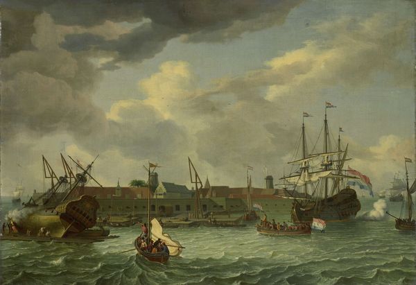 Curator: Abraham Storck, a master of the Dutch Golden Age, likely completed "The Roads of Enkhuizen" sometime between 1654 and 1708. The painting, rendered in oil on canvas, captures a bustling cityscape on the water. What strikes you upon viewing this piece? Editor: You know, I get a surprisingly serene vibe, considering the purported business. There's something so calming about that pale sky, reflected in the gentle movement of the water, with these sailboats drifting, not unlike the clouds above them. Curator: Indeed, Storck's employment of atmospheric perspective creates a tranquil distance despite the activity. Notice the precise detailing of the ships—each sail, each mast rendered with accuracy—contrasting the more subdued treatment of the water. Editor: Absolutely! Each vessel has a life of its own! It makes me think of little soaping boats, dancing along the canvas. Did they use them as fishing boats in those days or for more artistic ambitions like plein air painting, maybe even for piracy, who knows... the sails are what make you wanna leave everything behind and set off! Curator: The prevalence of marine paintings, or seascapes, during this period served not just aesthetic purposes, but acted as symbols of Dutch maritime power, prosperity, and far-reaching trade networks. Each vessel would represent these traits, making "The Roads of Enkhuizen," a genre painting steeped in the dominant political landscape of the time. Editor: Interesting, you can read power even between the painting’s brushstrokes! Still, to me, there's something more simple, like folk memories in here, it talks about that inner craving for horizons—an idea maybe that even pirates are but children of some lost paradise. I bet it’s all connected at some primal point. Curator: Well, it is difficult to separate symbolism and nostalgia given the test of time. I find the work valuable as an aesthetic snapshot, regardless of intent, due to the strong rendering of historical specifics—as is usually the case with realism. Editor: In the end, isn’t that what art’s supposed to do anyway: catch a moment and turn it into a place to return to, to think from? "The Roads of Enkhuizen" is no different; for an oil painting it manages to hold quite an essence of the here and now, and that, really, is what makes it eternal. Curator: An agreeable and eloquent sentiment to end on. Thank you.