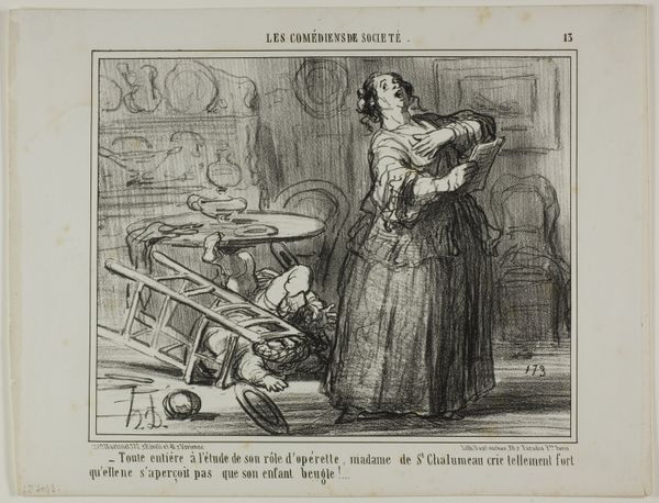 Curator: Daumier's lithograph, "Fully Engaged in the Study of His Role...," depicts a scene of domestic chaos. What strikes you first? Editor: The sheer theatricality. The woman mid-aria, oblivious to the tumbling toddler! It’s almost slapstick, wouldn't you say? Curator: Absolutely, the dramatic irony is key. Daumier often critiqued the bourgeoisie, and here he highlights their self-absorption. Notice the frenetic lines, conveying a sense of unease and the instability of family life. Editor: Right, the sketchiness emphasizes the fleeting moment and the overall disarray. But is there also some empathy, perhaps? For the woman, at least, lost in her artistic world? Curator: Perhaps a touch, though Daumier is primarily satirical here. It's a wonderful snapshot of societal follies through a family's turmoil. Editor: Well, it has certainly given me a chuckle and pause for thought!