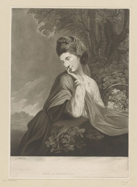 Editor: This is "Portret van Henrietta Cholmley," an engraving by James Watson, from around 1761 to 1763. It has this wistful, almost dreamy quality to it, wouldn’t you say? I'm curious, what strikes you most about this portrait? Curator: Ah, yes, Henrietta frozen in a thoughtful reverie! You know, it's the textures for me; the feathery softness of her fur-lined cloak against the smooth, almost luminous quality of her dress. It’s all a trick, of course – Watson working wonders with engraving. Editor: I hadn't considered that it was *all* engraving. It feels so painterly! Curator: Exactly! And that’s the beauty of Rococo portraiture. It strives for an idealized grace, a sort of... fleeting elegance. Think about the soft, diffused light and how it adds to that air of delicate femininity. She's posed outdoors, isn't she? The blurred, idyllic landscape behind contributes so much. Editor: It does lend this timeless, ethereal quality... Curator: Tell me, what do *you* make of her gaze? She's not quite looking *at* us. Editor: It’s introspective, maybe even melancholic. As if she's pondering some great question or, perhaps, a love lost. It makes her so approachable, so human. Curator: And yet, there’s a stillness there too. The composition directs your gaze entirely on her, as she’s draped against the ledge. I love the details; the pearls, her delicate finger. Each component helps us consider the world she inhabited. An elegant and poised era where appearance held so much social value, or perhaps more personal significance too! Editor: Absolutely! It makes me appreciate the artistic skill involved in evoking such emotion with seemingly simple lines and tonal shifts. Curator: Indeed! We look into her portrait and see a glimpse of our own internal life; and how beauty holds different meaning throughout time.