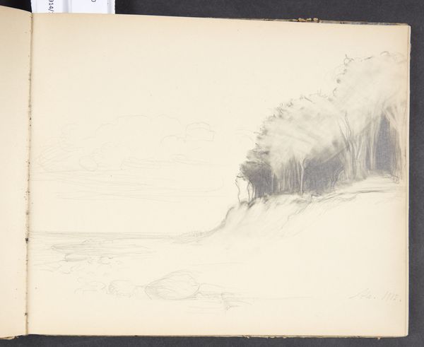 Curator: Up next, we have "Landschap met struiken," or "Landscape with Bushes," a pencil drawing on paper, believed to be created by Maria Vos sometime between 1834 and 1906. It resides here at the Rijksmuseum. Editor: The scene, despite being monochromatic, evokes a certain calmness, doesn’t it? A cluster of trees and foliage are meticulously captured with varying densities of pencil strokes. Curator: Vos’ choice to depict this serene corner of nature speaks volumes about the changing artistic priorities of the 19th century. The rising influence of Realism encouraged artists to find beauty in the everyday and observable world. This simple landscape becomes a study in natural forms. Editor: Precisely. Notice how she uses contrasting dark shadows and lighter areas to sculpt the mounds and shrubbery, suggesting a subtle interplay of light and shadow, the eternal struggle. Are those particular shrubs known in the region? Curator: I cannot be certain about the exact species represented, but more important to me are the symbolic associations it might have, with roots reaching deep, providing a haven for thought or perhaps illustrating resilience. Editor: True, but it's just as valid to recognize that this drawing may represent a departure from romantic ideals. The political and social upheaval in the Netherlands after the French period surely altered the function of art as a cultural signifier. It's refreshing to see what could also have been an independent-minded woman taking artistic risks in her period. Curator: Absolutely. Landscape art gained popularity due to these profound cultural shifts, functioning to bolster ideas related to nationalism and the role of nature as an arena for new philosophies and, crucially, industry. Editor: I am happy we were able to dwell a while on the work’s historical significance and not overlook her skill! It makes us rethink her time and place in Dutch art. Curator: I agree, and to appreciate how this piece operates on the threshold between meticulous observation and evocative representation reminds us how timeless even the simplest subjects may be.