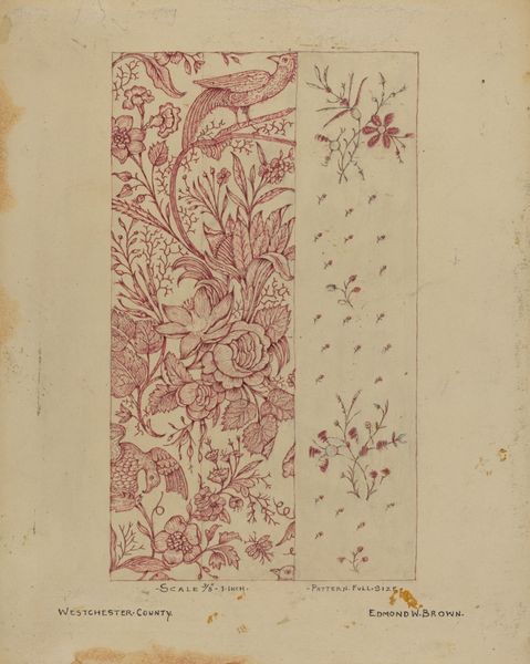 Mary Berner created this ‘Crewel Embroidery’ artwork, date unknown, with watercolor and graphite on paper. The composition is divided horizontally, featuring two views of the same embroidered design. Above, we see it in color, evoking a sense of warmth with its detailed floral and foliate motifs. The lower half presents the design in monochrome, focusing on its structural elements. Berner employs a semiotic system of natural forms to construct the design, using leaves, stems, and flowers to mimic nature's patterns, yet contained within a controlled, linear format. The chromatic range creates a visual harmony; the interplay of color and form invites a dialogue between artistic expression and the natural world. The two scales suggest a study in detail and utility, juxtaposing the aesthetic with the functional aspects of design. As such, the embroidery oscillates between decorative art and practical blueprint, questioning fixed notions of art's purpose. It invites us to see how art can function not merely as representation but as a critical engagement with our understanding of nature and design.