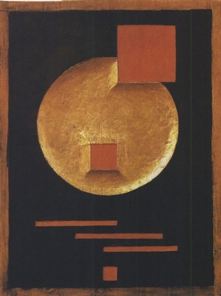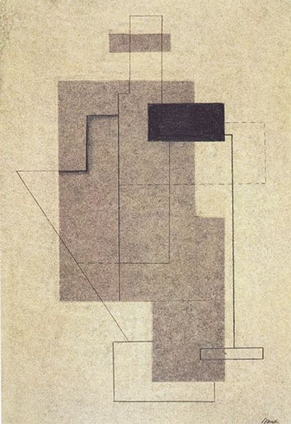 Curator: Here we have Lajos Kassak's "Pictorial Architecture V" from 1923, a mixed-media work that dances between painting and something more structured. Editor: It strikes me immediately as a stark visual poem. The geometric shapes—those rectangles, the arch—are bold, but the color palette feels strangely muted, lending a somber air. Curator: Kassak, a key figure in Hungarian avant-garde and constructivism, often used geometric forms to explore utopian ideals and the modern urban experience. Consider the symbolism in this "architecture": the rectangles as building blocks, perhaps, representing a society being built, layer upon layer. Editor: I appreciate the attempt at utopian vision, but the austerity of the colors makes me wonder if Kassak was also acknowledging the inherent rigidity, perhaps even the potential for oppression, within these systematized structures. I can't help but read it as a critique as much as a celebration of modernity. Curator: It’s fascinating how these simple forms become so laden with meaning. Look at the use of color – the red pops against the otherwise neutral background, but it’s a restrained, earthy red, not a vibrant revolutionary one. Could this point to a yearning for change tempered by a dose of reality? Editor: Exactly. And that heavy black line framing the whole composition – is it holding the building blocks together or imprisoning them? There's a duality, a tension between freedom and control, that speaks to the anxieties of rapid industrialization and social engineering in the early 20th century. Consider also the use of mixed media—oil, watercolor, ink—a deliberate breaking of the norms, fitting Kassak's legacy as an activist. Curator: So, through visual language, he's built an iconography not just of progress but of the anxieties that come with it. A pertinent theme resonating with contemporary times as well. Editor: Absolutely. Seeing it now, “Pictorial Architecture V” resonates beyond its original context, offering a continued challenge of how systems affect individual human existence and influence societal narratives. It’s a vital lesson indeed.