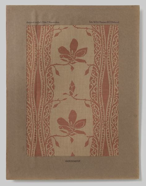 This textile design was created by Theo Nieuwenhuis. It’s a jacquard woven fabric featuring a dense, stylized floral pattern, mounted in a passe-partout. The key to understanding this work lies in the jacquard process. This is a mechanical loom, invented in the early 19th century, that automates the weaving of complex patterns. Prior to its invention, such intricate designs could only be achieved through laborious hand-weaving. The jacquard loom, in effect, democratized pattern, making it available to a wider market. Here, the choice of a steel warp—that’s the set of yarns held taut on the loom—adds a subtle sheen to the textile. Combined with the stylized floral design, the effect is at once modern and luxurious. It speaks to the ambitions of designers like Nieuwenhuis, who sought to reconcile industrial production with artistic expression. The finished product speaks to the complex relationship between design, technology, and labor in the early 20th century. It reminds us to consider how mechanized processes have transformed not only the making of objects, but also their cultural value.
