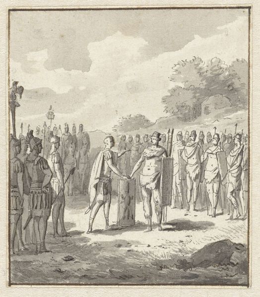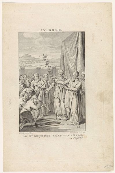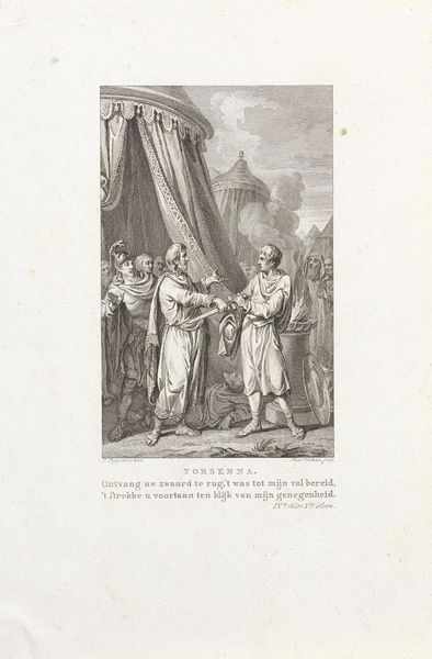 Editor: This is "Jodenvervolging in Engeland," or "The Persecution of Jews in England," an engraving by Noach van der Meer the Second, from 1784. The scene is quite stark, rendered entirely in black and white. There's a figure, seemingly an authority, gesturing toward a group of people who appear to be pleading. What symbolic significance do you see in this work? Curator: It’s a powerful depiction, isn’t it? Look closely. Notice how the authority figure, perhaps representing the English crown or church, is positioned higher, almost separate, from the huddled mass of Jewish people. His gesture isn't just pointing, it's directing, demanding. The vulnerability of the group is highlighted by their posture—heads bowed, hands clasped. It echoes centuries of forced conversions and expulsions. Can you discern any other repeating motifs? Editor: I notice crosses appearing on clothing and on top of what appears to be some sort of building. And is that a body lying on the ground? Curator: Yes, observe how Van der Meer uses Christian iconography here - not merely as a historical marker, but as a visual tool of power and oppression. Crosses emblazoned on chests of people, and church tops symbolize a system poised to either indoctrinate or expunge people based on their spiritual convictions. As for the body, it shows what is a literal symbol of sacrifice, but I wonder, is it to stay, or to flee? The title suggests more of this occurred. These visual reminders of religious dominance were tools used in solidifying cultural memory. Editor: So, it’s not just depicting a historical event, but reinforcing a certain perspective, a narrative of dominance through shared cultural symbols? Curator: Precisely. Engravings like these shaped public perception. They imprinted images of power and submission onto the collective consciousness, solidifying narratives of religious and cultural othering that unfortunately lingered for generations. Looking at it now reminds us that visual language is indeed always encoded, deliberately constructed, to affect how we view ourselves and each other. Editor: That makes me see the image completely differently, the symbolism driving a narrative with lasting consequences. Thank you for pointing all of this out!