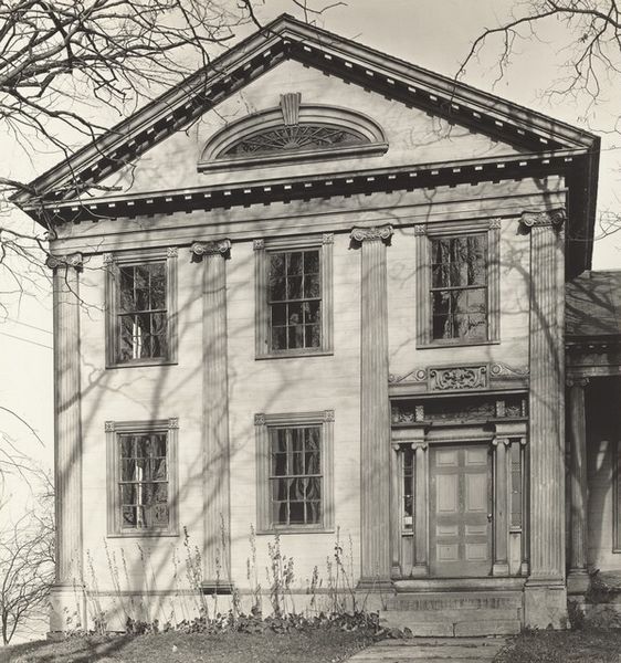 Curator: This gelatin-silver print is titled *Uncle Sam Plantation*, and was captured in 1935 by Walker Evans. The image is part of the collection at the Minneapolis Institute of Art. Editor: It immediately strikes me as austere, monumental but decayed. The facade of the house, weighed down by all of those columns, it's almost as if the building itself is weary. Curator: Evans's unflinching eye gives us more than just a building; he conveys the burden of history embedded in the architecture of the American South. These structures, while physically imposing, also carry complex stories. Editor: You’re right. Looking closer, there’s such an emphasis on the verticals—those powerful columns acting like insistent visual punctuation. And how the linear elements intersect, those railings and posts, create these layered receding planes... it lends such depth, a gravity I would almost call elegiac. Curator: The very name, “Uncle Sam Plantation,” carries multiple layers of meaning. "Uncle Sam" symbolizes the United States, so its association with this particular type of building implies a relationship to nation-building, but also to the brutal legacy of plantation economies. Editor: Exactly! It's the composition, though, that solidifies this sensation. That strong horizontal emphasis—the balconies and roofline. Then it all resolves into this weighty geometry; all angles and repetitive forms. There's no escape. The columns even resemble bars… Curator: This tension speaks to a central dichotomy: The desire to uphold a sense of grandiose identity whilst simultaneously facing the truth behind the sources of its wealth and power. This photograph acts almost as an uncomfortable mirror. Editor: The photograph really embodies that conflict so elegantly by presenting this architectural form in pure monochrome – devoid of anything pretty or palatable. Stark beauty revealing underlying structural inequities. Curator: Absolutely. The power of Evans's work is his ability to elicit our engagement with tangible cultural fragments of a conflicted nation, using realism as both artistic choice and pointed social commentary. Editor: Yes, I find this photograph more impactful for noticing those aesthetic considerations: proportion, tone, balance… they intensify what might be overlooked in mere history.