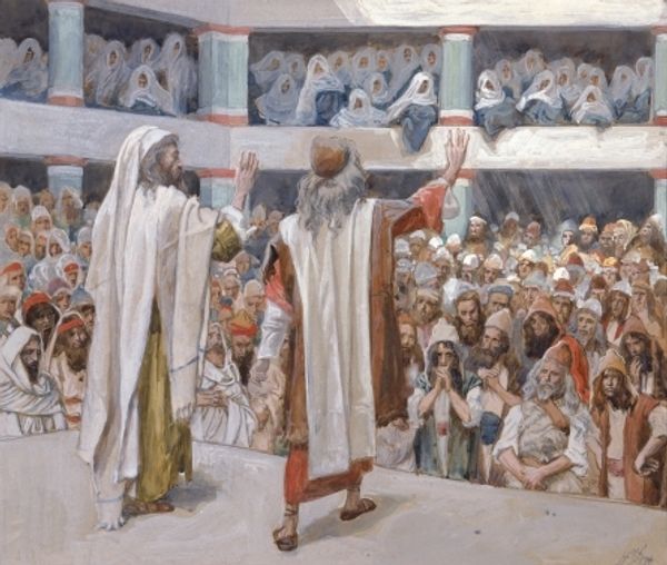 Curator: Looking at Fyodor Bronnikov’s “Before Entering the Arena,” painted in 1873 using oil paint, my first thought is how dramatically he stages this moment, with the darkness inside playing against the expectant figures at the door. Editor: That threshold… yes, it's fraught. To me, it speaks of the ancient world's brutal spectacles but also broader rites of passage— the transition, willingly or not, to a space of challenge. Curator: Challenge for sure. We see supplication in the foreground, those figures kneeling, maybe praying. Are they pleading for mercy or strength? There’s such vulnerability in those upraised hands, echoed by the more withdrawn figure sitting off to the side. He looks resigned. Editor: Those figures have a distinctly tragic air, indeed. The supplicants reflect an old motif – abject pleas before implacable power. Even those offering what seem like ritual assurances can't disguise a kind of ritual dread hanging in the air. Their garments feel heavy with the weight of history and fate. I imagine them carrying burdens as well. Curator: It's that light though. It streams past them, beckoning but offering no real comfort, only highlighting their expressions and making them more theatrical. Bronnikov emphasizes that ambiguity with muted, earthy tones everywhere except where it hits skin and fabric. Editor: Agreed, the painting lives in the play of chiaroscuro—the light-dark contrast shaping our response. I would call attention, too, to how the characters group – supplicants clustered left, passive figures to the right, the white-robed priest positioned centrally in the manner of figures in a procession from the ancient cultures. Such formal organization speaks to Bronnikov's training and intentional symbolic arrangement. Curator: A calculated dramatic display, but what exactly does it signify? A warning? The terror of an inescapable decision? Bronnikov leaves the narrative open, but loaded with unease. It is really amazing. Editor: Absolutely, Bronnikov captures a universal sense of apprehension before an event horizon – a point of no return, if you will, that permeates his entire composition with remarkable power. I see not just figures, but emblems of fear and hope, bound within an unfolding drama that goes well beyond this painting's arena.