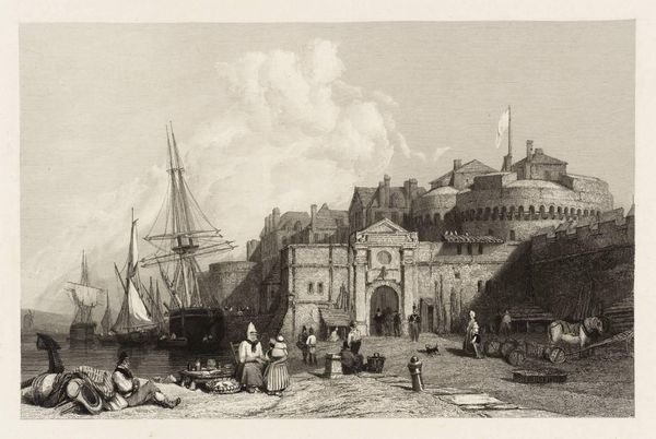 Editor: This is "St Malo," an engraving by Clarkson Stanfield. The detail is incredible! The mood feels… bustling, but also kind of timeless, like a memory. What strikes you most about this print? Curator: The texture, definitely. The way Stanfield, through Armytage’s engraving, renders the rough stone against the billowing clouds… it's a dance between solidity and ephemerality, isn't it? Notice how he juxtaposes the man-made structures with the natural elements, almost blurring the lines. Does that suggest anything to you? Editor: Maybe the fleeting nature of human endeavors against the backdrop of history and nature? Curator: Precisely! And isn't it interesting that a medium so traditionally associated with precision can evoke such a sense of the atmospheric? It's a gentle reminder that art is always about seeing, and feeling, beyond the surface. Editor: I hadn't considered that. Now I see something completely different. Thanks!