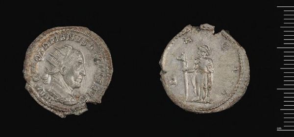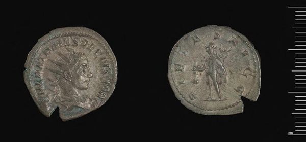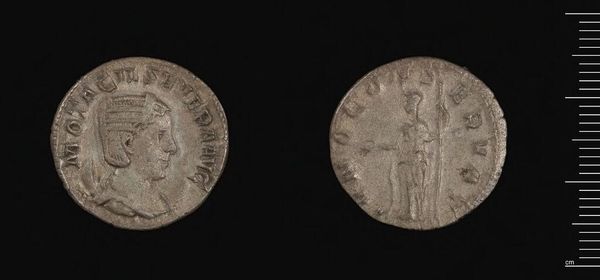 Editor: This is an Antoninianus of Herennia Etruscilla, a Roman coin. It feels so weighty, not just physically, but with history. I’m curious, what meaning do you find embedded in such a small object? Curator: Coins are fascinating because they condense so much symbolic power. Consider the portrait itself, a carefully constructed image intended to project authority, permanence, and idealized virtues. What messages do you think Herennia Etruscilla wanted to convey? Editor: Strength, perhaps? Maybe even divinity? The gaze is very direct. Curator: Exactly. And the figure on the reverse? That's often a deity, furthering that association with divine right. Coins were tools of propaganda, instantly recognizable and circulated widely, constantly reinforcing specific ideologies. Editor: It's incredible how much information can be conveyed through such a small medium. Curator: Indeed. It gives us a real glimpse into the values and power structures of the time. I find something like this helps me better understand the psychological impact of imagery on populations. Editor: It makes you wonder what stories this specific coin could tell.
