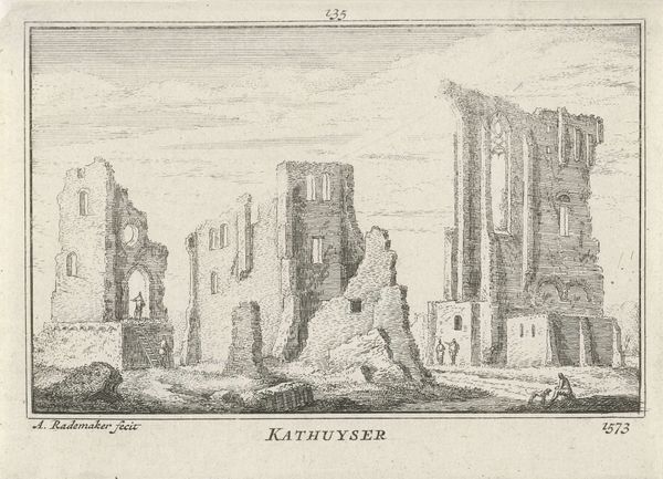 Abraham Rademaker created this print called 'View of the ruined proosdij of the Koningsveld monastery' in 1573. But there's a fascinating time warp at play here, Rademaker wasn't even born until 1675. This piece isn't just a landscape; it’s a window into the religious and political upheavals of the 16th century. The Koningsveld monastery was destroyed during the Dutch Revolt, a fight for independence against Spanish rule. In choosing to depict these ruins, Rademaker isn't simply documenting a historical site; he's engaging with ideas of loss, and the impact of religious conflict on the land and its people. There's an emotional weight to this image, as it prompts us to reflect on the human cost of conflict. Ruins remind us that even the most powerful institutions can crumble, and that history is full of stories of destruction and resilience.