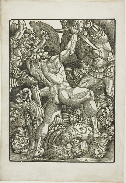 Curator: The Labors of Hercules: Bringing Cerberus from the Lower World, a print dating back to circa 1528, is now hanging in The Art Institute of Chicago. Editor: There's a ferocity in this image, a rawness. The stark contrast of the engraving amplifies the struggle, doesn't it? Curator: Indeed. The artist, Gabriel Salmon, used the classical story of Hercules’s final labor to explore ideas around strength, overcoming death, and even redemption. Hercules’ descent into the underworld and return mirrors ancient initiatory rites and the hero's journey of transformation. Editor: Look at the composition – the figures are so densely packed together! The musculature of Hercules is emphasized, almost idealized, through this very precise cross-hatching. He seems less interested in rendering light realistically, and more focused on volume. Curator: The three-headed dog Cerberus, guardian of the Underworld, of course, represents the terrors and mysteries of death, yet Hercules subdues him without weapons, using only his immense strength. This isn’t merely a show of brute force; it symbolizes the triumph of the human spirit, its potential for controlling and overcoming inner demons. Editor: Precisely! And notice how Salmon employs strong diagonal lines. Hercules lunges upward and rightward, while Cerberus forms this swirling mass below, contained but untamed. The formal tension communicates conflict. Curator: And think of the broader symbolic resonance of taking a monstrous creature like Cerberus from its familiar place. Bringing it to the light symbolizes a reckoning with previously unseen aspects of existence or knowledge. Its wild and fierce heads indicate its untamed quality. Editor: Absolutely. Examining how Salmon utilizes engraving techniques allows for close scrutiny of detail and line weight. Curator: I agree. The artist challenges us to interpret universal narratives in symbolic ways. Editor: Analyzing it has only enriched the art.