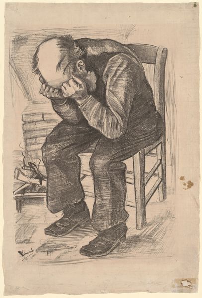 Editor: So, this etching from 1876, "Oude man bestudeert een schaal" or "Old man studying a bowl", by Piet Verhaert, it feels so intimate, so focused on this single figure. What do you see in this piece? Curator: I see a potent commentary on aging and knowledge. Note how Verhaert chooses to depict the subject. He's not idealized, nor is his labor glorified. Instead, he’s rendered in a quiet moment of contemplation, bent over, seemingly removed from the bustling industrialization happening outside the frame. Doesn’t that make you consider the value placed on experience versus the pressure to constantly produce in the late 19th century? Editor: That's interesting. I was just thinking about how focused he seems on the object. Is it perhaps meant to also convey class distinctions? Does his attire have a message, maybe the worn clothes suggest a certain socio-economic bracket? Curator: Absolutely. Consider the setting and his garments. They're humble, signaling a lack of access to upward mobility, which raises further questions. Who is granted the space and resources for intellectual pursuits? How is that access structured along class lines, but perhaps also regarding gender? In what ways is the knowledge that this old man possess devalued? Editor: I hadn’t thought about the implied social commentary as being that direct, though now it feels pretty obvious! Thanks, that gives me a lot to consider about Realism and social class in art. Curator: It's about considering those questions, understanding whose stories are told, and by whom. Art invites us to challenge the narratives, the assumptions, we often take for granted, and maybe even build our own bowls, so to speak.