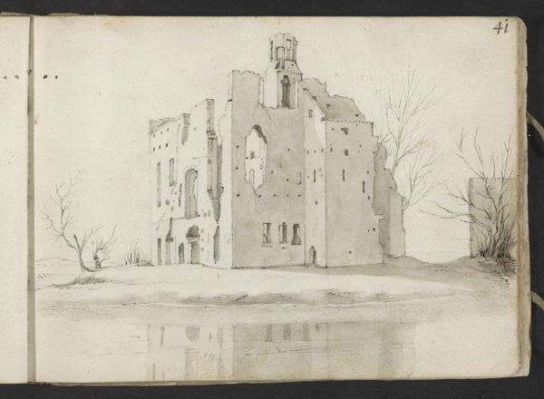 Editor: This is Gerard ter Borch's "Ruïne van Kasteel Brederode," made in 1634, using ink, tempera and other drawing media on paper. There’s a somber mood looking at these crumbling ruins, a ghost of its former self. How should we interpret the artist's choice of subject matter here? Curator: Indeed. The choice of ruins, especially during the Dutch Golden Age, reflects a broader interest in themes of mortality and the transience of power. The Brederode Castle was not just a building; it represented a lineage with significance in Dutch history, tied to resistance against Spanish rule. Borch, by depicting its ruins, engages with a narrative of national identity and loss. Editor: So, it's more than just a landscape? Was the ruin a popular symbol? Curator: Precisely. While aesthetically pleasing as a landscape study, ruins like this served as a potent political and social reminder. Think about the socio-political context: the recently concluded Eighty Years' War. Depicting such a ruin wasn't merely nostalgic; it subtly highlighted the costs of conflict and the impermanence of earthly authority, acting almost as a moralizing symbol to viewers of the time. Consider who would have viewed this work, and where. How would the location of the art add meaning? Editor: That makes perfect sense. It's a stark reminder, subtly woven into a landscape. I now see that ruins can speak volumes about the present. Curator: Yes, it prompts reflection on the cycle of power, destruction, and memory, connecting historical events to the everyday lives of its contemporary viewers. Appreciating those socio-political links adds incredible meaning.