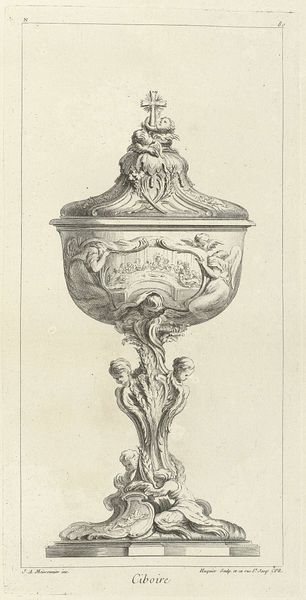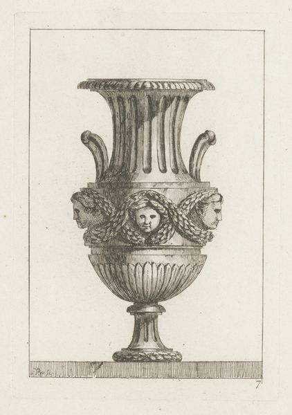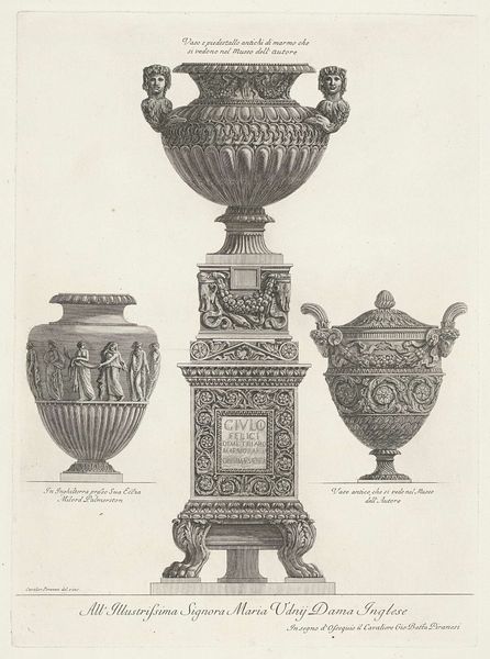 Editor: Here we have Giovanni Battista Piranesi's "Drie vazen waarvan een op voetstuk," created in 1778. It's an etching and engraving, giving it such precise linework. I am immediately struck by the level of detail – it feels like I could get lost in it! What stands out to you? Curator: Well, beyond the exquisite detail, I see Piranesi engaging in a visual argument about power and taste in the late 18th century. Think about it: here he’s meticulously documenting, almost celebrating, these elaborate vases. But for whom, and to what end? Editor: Are you saying he might be critiquing something? Curator: Precisely! The Neoclassical style was becoming fashionable, embraced by elites who sought to connect with the perceived virtues of the Roman Republic and Empire. Piranesi, by presenting these objects as desirable, might also be subtly commenting on the emerging consumer culture and how objects mediated social standing. The form takes centre stage. Is he reinforcing that society’s tastes, or questioning them? Editor: I hadn't considered that angle at all. So the image itself participates in the society it depicts. And it’s dedicated to “A Sua Eccellenza Miledi Maria Fox…” Was she a patron? Curator: Almost certainly a member of the elite Piranesi was targeting and serving. What better way to spread and solidify Neoclassical principles, in the form of decorative art? Now consider, if he only created such objects through printed works, would that still be considered decorative art? Editor: It sounds like he's navigating a complex web of patronage, artistry, and societal commentary all at once. I learned a lot. Thank you! Curator: The pleasure was mine. It’s always about asking: Who benefits from this image, and whose values does it promote?