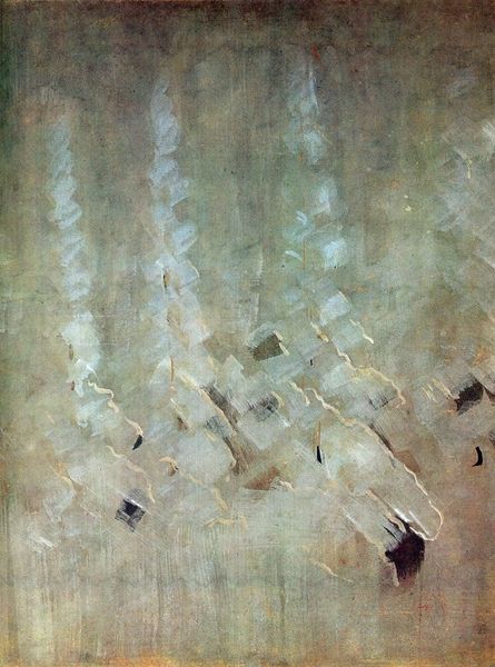 Editor: This is Whistler's "Nocturne in Blue and Gold, Valparaiso Bay" from 1866, done with oil paint. It gives me a sort of hazy, dreamlike feeling; it’s so muted and the brushstrokes are really loose. What do you see in this piece, particularly in terms of symbolism or the feeling it tries to evoke? Curator: That haziness is key. Consider the color blue: historically it represents not just peace and tranquility but also distance, the untouchable, even melancholia. The shimmering gold might then be read as a kind of fleeting beauty, moments of warmth amidst the pervasive coolness, don't you think? Editor: I can definitely see that, but why those colors specifically? And what's with calling it a "nocturne"? It sounds like music. Curator: Exactly. Think of how music evokes emotion abstractly. Whistler sought to do the same visually, pulling from associations of night: mystery, the subconscious. But more specifically, in that era, blue and gold held significant spiritual associations of purity and opulence within religious iconography and royal insignia. Whistler uses that cultural memory, that resonance. It begs us to think, what might those glimmers of gold on the water’s surface signify in our subconscious understanding of purity in a bustling cityscape? Editor: Wow, I never would have thought about all of that just from looking at it! It's amazing how much an image can hold. Curator: Visual art acts as cultural memory. It shows continuity through its symbols, filtered and presented for interpretation by each generation. Editor: It does make me see it in a whole new light. Now I feel like I'm understanding it at a deeper level.