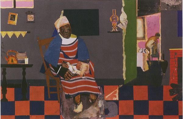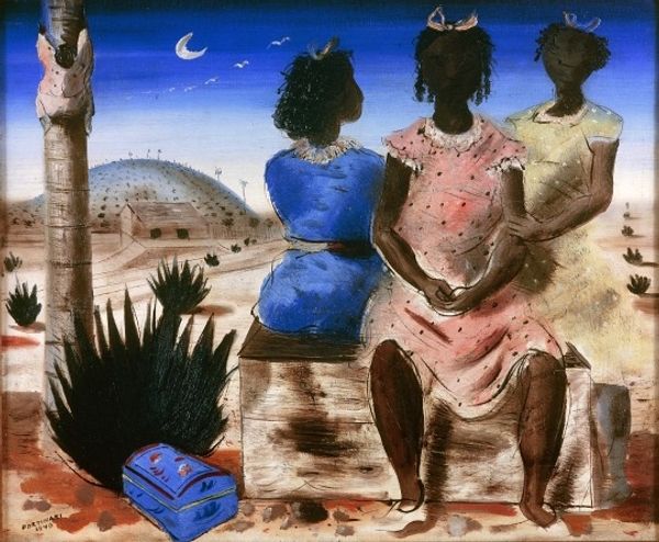 Curator: This oil on canvas from 1926 is entitled “Titi and Naranghe, Daughters of Chief Eki Bondo,” and was painted by Alexandre Jacovleff. It offers an intimate glimpse into the lives of these young women. Editor: It's surprisingly tender, isn't it? There's such a strong sense of connection, yet the landscape is almost... clinical, despite the warm colors. A fascinating juxtaposition. Curator: Exactly! Jacovleff masterfully employs a high degree of realism in the portraiture, contrasted with a nearly decorative use of pattern in the background textiles, typical for its context and yet it gives the overall image this feeling of staged naturalism, doesn’t it? Editor: The geometric designs are incredibly striking. They almost compete with the figures for attention, creating a visual tension. Then, beyond, in the distant, more casually-rendered scenery – little hints of activity and habitation in an untouched background – the village and lone figure introduce a lovely subtle sense of everyday life and local habit. Curator: Jacovleff traveled extensively and was profoundly impacted by the cultures he encountered. You can feel the respect for the culture of his subjects here, it transcends objectification. Look at the positioning and their mutual embrace, and look also to their relaxed state; their subtle adornments. It offers a delicate blend of observation and intimacy, right? Editor: Yes, the subtle gold embellishments against their skin! Yet he refrains from sentimentalising. His ability to depict the human form realistically yet simply creates something incredibly pure. The slight angle of her head and soft, almost pleading glances. Beautiful Curator: Their shared gaze pulls the viewer in. In a way, the piece seems to explore how personal relationships sit inside culture and also transcends culture Editor: The play of gazes indeed evokes volumes! What looks initially quite straightforward opens to new considerations about representation and how identities emerge within our gaze and reciprocally shape one another. So powerful Curator: Agreed. There is just something remarkably timeless, universal and intimate within this portrait. Editor: Absolutely—I came looking at structure and surfaces, and have come away thinking about souls and relationships. A perfect way to travel.