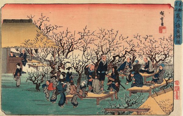 Editor: Here we have Utagawa Hiroshige's "Cherry Blossoms in the Yoshiwara" from his "Famous Places in Edo" series. The figures are really wonderful, and the buildings have such great character, but overall it feels muted to me. How do you interpret this work? Curator: Muted, yes, but isn't that part of its charm? The print whispers of fleeting beauty and pleasure, like a memory. Hiroshige captures the Yoshiwara not as a place of pure decadence, but of everyday life tinged with transience, doesn't he? Editor: That's a lovely way to put it! I was so focused on the subdued palette, I missed that. Curator: It's easy to do! The key is in the balance: the ephemeral cherry blossoms against the solid architecture, the fleeting encounters within the established structures. Editor: I see, it’s a whole world in balance. Thanks for helping me see it! Curator: My pleasure! It's a reminder to find beauty in the ordinary, don't you think?