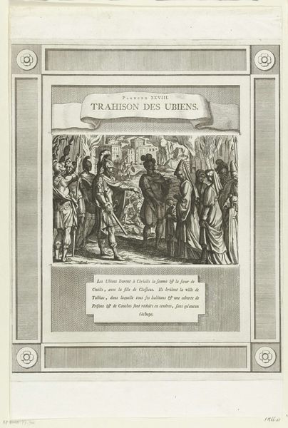 This print, "Women and Children Watching Civilis Battle the Romans, 69-70," was made by an anonymous artist. The black ink lines on off-white paper capture a scene of ancient conflict with a detached coolness. Note how the composition is divided into distinct planes. The foreground presents onlookers, rendered with careful cross-hatching to define form and texture. The background is a whirlwind of tiny figures engaged in battle that recedes into a distant fortress, establishing depth and scale. The artist uses line to create areas of light and shadow, particularly in the drapery of the figures, adding volume to the composition. The image is bordered by a decorative frame, which serves to contain and distance the viewer from the violence it portrays. This framed battle scene reflects the visual culture of its time, where events were often mediated through the objective lens of artistic representation. It is a reminder that art does not merely reflect events but shapes our understanding of them.