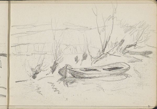 Editor: This quick sketch, "Weiland omgrensd door bomen en een hek," made between 1848 and 1888 by Anton Mauve, feels so immediate, like a captured moment. It's just pencil on paper, very simple, but I’m curious, what can we read into its raw execution? Curator: Its simplicity is precisely where the richness lies. Notice how Mauve’s rapid strokes delineate not just form, but also texture – the rough bark of the trees versus the interwoven strands of the fence. This emphasis on the physicality of the landscape mirrors a growing interest in portraying the working environment, reflecting a societal shift toward valuing manual labor and its connection to the land. Do you think the apparent casualness challenges traditional, academic drawing? Editor: Absolutely. It feels like a departure from highly finished works, focusing instead on the process of seeing and recording. Does this choice of material, just humble pencil and paper, impact its interpretation? Curator: Critically so. Pencil, as a readily available and inexpensive material, democratized art-making. No longer solely reliant on the patronage of wealthy clients who funded expensive oils, artists could now document the world around them more freely. This informs how we view both artist and the context. How does knowing its in the Rijksmuseum changes your read? Editor: That's interesting to consider. Being displayed in the national museum gives it a weight and permanence, contrasting with the sketch's temporary and fleeting quality. The museum transforms it into something to be studied rather than something quickly jotted down. Curator: Precisely! And this act of preservation raises important questions: Who decides what is valuable, what labor should be conserved and celebrated and how those decisions influence the production of artistic output. It's a good reminder that how art is shown really shapes our perceptions of not just value, but labor itself. Editor: I see now, it's a fascinating perspective, viewing this sketch through the lens of materials and its production, shifting focus to accessibility and the value society ascribes to the work. Curator: Indeed. Every mark, every material choice tells a story far beyond the surface representation.