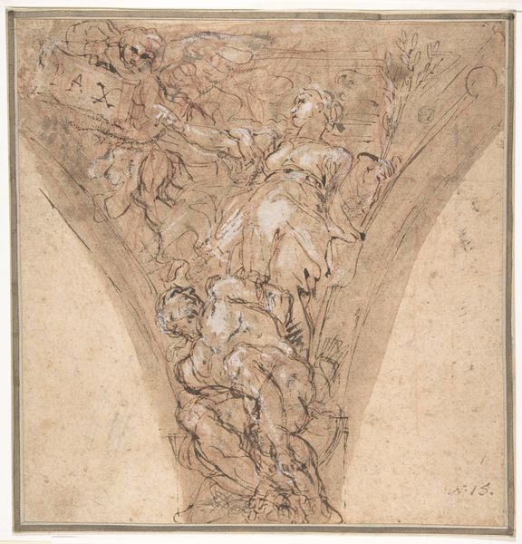 Joseph Wilton made this study using pen and brown ink, likely in preparation for a larger sculptural project. Wilton was a successful sculptor in 18th-century Britain, known for his marble monuments and architectural decorations. The drawing gives us a glimpse into his process. Pen and ink allowed Wilton to quickly explore ideas, capturing the dynamism of angels and the symbolic bull of St. Luke. Notice how the fluidity of the ink creates a sense of movement. The layered strokes build up volume and texture, particularly in the swirling clouds. Wilton's skill is evident in his control of line and tone, achieving a sculptural quality on paper. While seemingly simple, this drawing represents a significant amount of artistic labor. It connects to a broader history of skilled craftsmanship and the central role of drawing in artistic production. Appreciating the making of this artwork allows us to consider the creative process and the artist's hand.