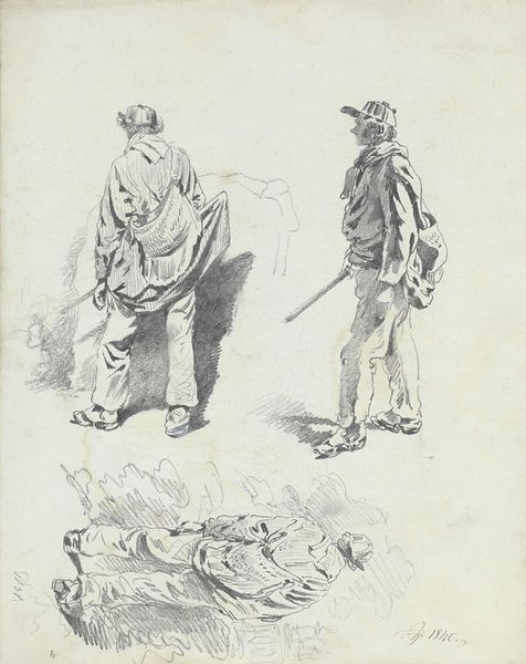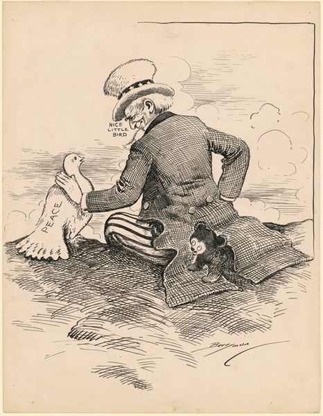Jean-Louis Forain created this drawing with crayon and charcoal, most likely during World War I. The image shows two soldiers locked in an embrace on what appears to be a battlefield, observed by discarded hats and weapons. Forain chose crayon and charcoal for their expressive potential, using the soft, smudged lines to create a sense of immediacy and urgency. The marks allow the artist to achieve tonal variations and textures that provide depth and volume. This artwork can be seen as a process based on the traditional art of caricature and illustration. The choice of these media also carries cultural significance. The techniques evoke the tradition of journalistic illustration, suggesting the conditions on the front line, the consumption of news, and the cultural and political mood of the time. The amount of work involved in producing such an image for print media emphasizes how much labor was involved. Therefore, by examining the materials and processes, we gain insights into the artist's intentions and the broader social and political context in which the artwork was created.