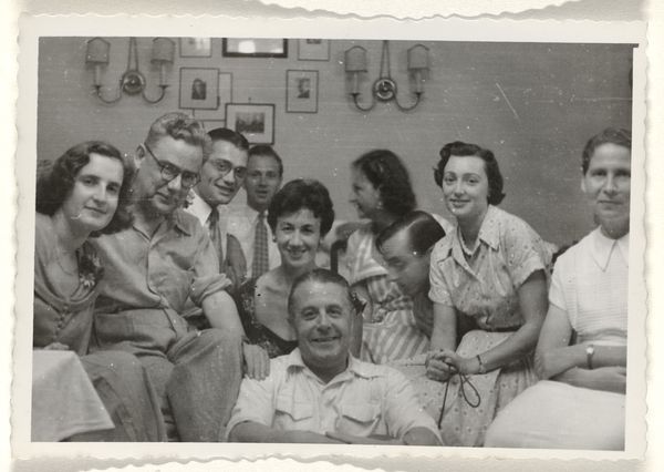 Curator: Today we’re looking at a gelatin silver print titled "Isabel Wachenheimer met een onbekende man en een onbekende vrouw tijdens een banket voor de armen" by an anonymous photographer, created sometime between 1946 and 1963. Editor: Right away, it feels like peeking into a memory, doesn't it? A snapshot, faded at the edges, yet capturing a world, a gathering. The monochrome lends this such a beautiful nostalgic weight. Curator: Precisely. The composition presents a curious blend of formality and candidness. The subjects are posed, yet there's an element of spontaneity, almost as if the photographer caught them mid-conversation. The grain adds a layer of texture. Editor: Definitely. The contrast between the crisp details of the figures and that slightly blurred, grainy background enhances the narrative, creating this sense of both presence and transience. You see the slight smiles, the almost theatrical poses—everyone trying so hard to act normal in front of the lens. Curator: Observe the layering effect as well, the arrangement of bodies which generates a spatial complexity, leading the eye through different points of interest, like navigating through various conversations at once. The formal arrangement plays cleverly with intimacy. Editor: It also looks at relationships between people. This isn't just people at a banquet for the poor; these people seem to have real stories with each other, whether through shared laughter, social expectations or maybe just fleeting encounters. I'm so intrigued. I imagine stories about love or rivalry… The mood is a bittersweet one; there's joy, and then also a kind of gentle melancholy. Curator: It also opens itself for questions about identity. This moment immortalized forever—by whom, for what? The interplay between representation and reality creates intriguing discourse. Editor: Ultimately, though, it is also a beautiful snapshot of what might otherwise be lost; this piece captures, distills and leaves its audience enriched. The work resonates because its form captures something truthful of human experiences. Curator: A pertinent observation indeed. This exploration into image texture, perspective and candid composition offer invaluable insight for contemporary study.