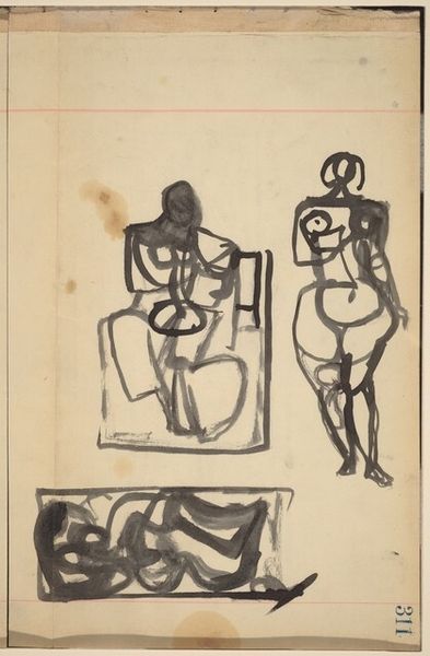 Curator: This is Franz Kline's "Two Studies of Standing Female Nude [recto]", created sometime in the 1940s or 50s. He used ink on paper to achieve this image. Editor: The starkness hits me first. These women rendered with such bold, dark strokes on that pale paper... they feel exposed, vulnerable. Curator: Kline was a leading figure in abstract expressionism. It's interesting to consider this drawing of female nudes in that context. He’s not just capturing the figure, he's engaging with the politics of representation, deliberately using raw, unrefined strokes. This work could also be put in dialogue with contemporaneous views on female bodies, sexuality and power. Editor: Precisely. Notice how the density of the lines around certain areas, like the one figure's hair, or the implied curvature of their hips, creates a potent visual emphasis. It’s as if he’s highlighting culturally significant features, inviting the viewer to project their own ideas about beauty, sensuality, or societal expectations onto these archetypal figures. Curator: The composition, too. Two figures, but distinctly rendered. The figure to the left almost dissolving into a sketch. It almost creates a ghostly contrast, forcing one to question not only the gaze directed at women in art, but the inherent power dynamic between artist and model as well. Editor: Indeed. Even in its incompleteness, the suggestive nature of each figure, rendered by such thick bold lines, sparks emotional recognition. We fill in the blanks from a deeply personal reservoir. Consider what the simple act of depicting such recognizable, culturally-entrenched themes as "femininity" or "beauty" means within Kline's artistic vocabulary. Curator: This exploration of identity, gender, and power dynamics seems even more relevant today. The raw and unfinished aesthetic challenges idealized depictions of the female form, provoking conversations about societal beauty standards. Editor: And it’s through symbols, or the *lack* thereof here – Kline offers minimal symbolic identifiers -- that the essence shines through. A connection to fundamental human experience is created by the stark form of simple lines, inviting introspective reflection and emotional recognition of cultural memories and experiences of our own past. Curator: Seeing it through both lenses – yours, focused on enduring symbolic weight, and mine, highlighting historical and social commentary, brings fresh perspectives. Editor: Yes, what a provocative work!