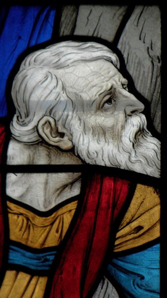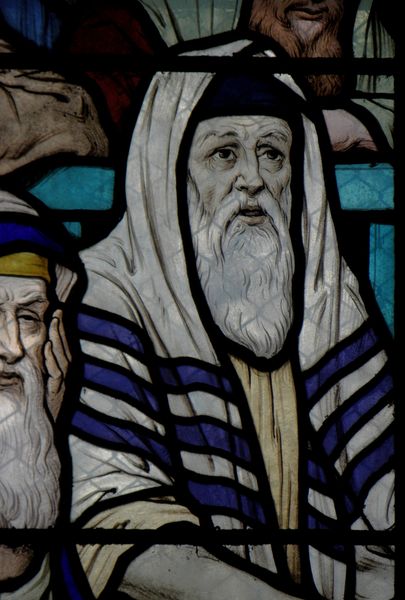 Curator: This stained glass detail, part of a larger narrative cycle titled "Life of Christ" found in the Église Saint-Sulpice de Fougères, was crafted around 1919 by Ludovic Alleaume. Editor: It's stunning. The detail, the luminosity... I'm immediately drawn to the intense expression on that central figure's face and the heavy, textured drapery. It feels almost tactile. Curator: Indeed, Alleaume’s work here is particularly interesting. Stained glass as a medium held a significant public role in the early 20th century, serving to visually communicate religious stories to a wide audience within the context of post-war rebuilding and spiritual renewal. Editor: Absolutely. Look at the hand-painted details on the glass, mimicking the folds of the fabric and the lines etched on the man's face. It is almost a revival of romanesque mural art into the medium of glass and all of that during the rise of industrial art production after the first world war. The deliberate choice to create it by hand carries its weight. Curator: The church itself contributes to the artwork’s significance. Église Saint-Sulpice served as a local focal point, embedding the "Life of Christ" cycle within a narrative of communal identity and religious doctrine. It reinforced the church's power. Editor: I'm curious about the production process. The way the light filters through the glass seems integral to the piece. How did the craftsmen assemble such intricate designs from individual pieces? Considering the era, they were working pre-digital fabrication. Curator: The lead lines, essential to the structure of the glass, also act as part of the image. Their blackness further accentuates form and highlights key figures. Note how they guide your eye across the surface and emphasize emotional tension. Editor: Seeing the care put into something inherently fragile as glass brings the message of hope. Thinking about it as material labor, each figure here—biblical or artisan—connects within their community of creation. Curator: Exactly, a dialogue between history, belief, and community expressed through Alleaume's artistry and the labor invested in glassmaking. Editor: It’s a testament to human connection, expressed through careful craftsmanship. A profound material record to meditate upon.