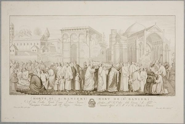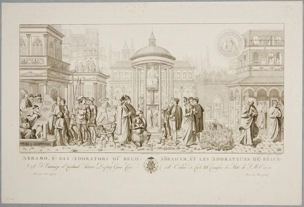 Editor: This print, “The Birth of Jacob and Esau,” by Conte Carlo Lasinio, depicts a very busy birthing scene. I’m struck by the architecture and the sheer number of figures. How do you interpret the symbols at play here? Curator: Consider the Renaissance architectural setting—the arches, the columns. These are symbols of civic pride and order, reflecting a humanist worldview. But observe how this idealized space is filled with a chaotic domestic scene. Do you see a tension there? Editor: I do. The order of the architecture contrasts with the intimate, perhaps messy, reality of birth and family. It’s like two different worlds colliding. Curator: Precisely. The birth of twins itself, in many cultures, carries symbolic weight, often seen as both a blessing and a disruption of natural order. Notice how the artist juxtaposes these themes. Editor: That tension makes the scene much more compelling. I'll definitely keep that in mind moving forward. Curator: Excellent. These layers of symbolic meaning are what make art so enduring, aren't they?