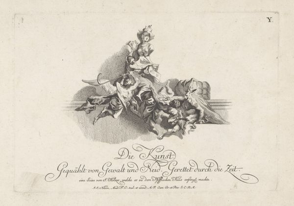 Curator: Welcome. Before us is an interesting piece titled "Silenus en Flora." This engraving and etching, made sometime between 1731 and 1775, is currently held in the Rijksmuseum collection. It’s an allegorical depiction set within a detailed landscape. Editor: My first impression is one of contrasts. The monochrome gives it an antiquated feel, almost like looking at a faded memory, but there’s a certain playful lightness conveyed through the figures and flourishing details that prevents it from feeling melancholic. Curator: It's fascinating to consider the choices in representation, specifically, how this artwork interacts with notions of the idealized past and nature through classical figures and pastoral settings. These are typical themes that often appeared in art during the baroque period, often employed to convey messages of power and culture. Editor: Precisely, and I think it's crucial we contextualize those visual decisions. Flora is not simply nature; she is controlled, idealized nature. Likewise, placing Silenus, associated with drunkenness and revelry, next to her creates a dialogue. What does that proximity suggest about how these contrasting principles reflect contemporary power structures? It calls for reflection on societal control and order. Curator: This work and others like it served specific societal functions. Prints such as this were frequently circulated amongst the bourgeois and aristocratic class of the 18th Century in the same way photographs circulate now. They are indicators of aesthetic taste. Also, let’s look closely at the detailed execution; notice the remarkable precision. Editor: The skill is undeniable, yes, and that precision, that technical expertise is exactly the thing that is both so alluring and so… concerning. Whose values are being amplified by its widespread circulation? It makes me question how the piece actively constructs or perpetuates systems of privilege. Curator: I agree that your reading highlights a deeper conversation, particularly given our contemporary lens and theoretical framework. Thanks to its complex and contested history, the role of this baroque print can still stimulate very important contemporary conversations. Editor: Indeed, it compels us to investigate these seemingly delicate images with thoughtful critique, acknowledging not just artistic expertise but social impact.