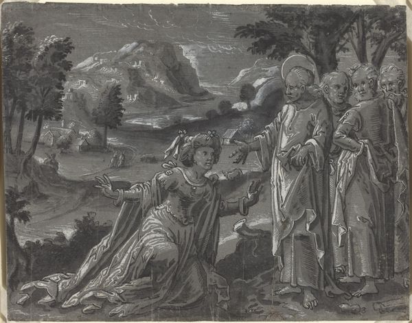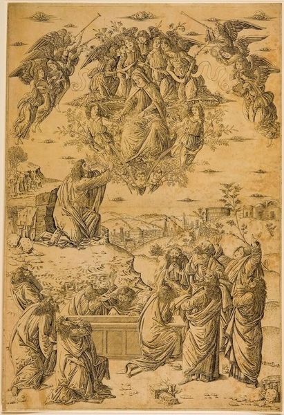 Curator: Domenico Ghirlandaio's "Stigmata of St. Francis," created around 1485 using oil paint and fresco, presents us with a visual narrative rich in both earthly and divine elements. Editor: My immediate impression is one of serenity tinged with suffering. The soft colors and the meticulously rendered landscape create a peaceful backdrop for such a profound, almost violent, spiritual event. Curator: Absolutely. Ghirlandaio’s material choices were likely quite deliberate. The fresco allowed for a monumental scale appropriate for its location—perhaps a church or chapel—demanding both visibility and longevity, whereas the integration of oil paint for detailing may point to a more nuanced, refined artistic statement meant to capture light and texture. Consider the social implications too; the commission itself signifies patronage and the values held within that sphere. Editor: And the symbolism! We see St. Francis receiving the stigmata—the wounds of Christ. This bestows an almost direct connection, making Francis a renewed Christ-figure. Look at the small figures emerging from the clouds, surely angels, they act as witnesses to this miraculous moment, reinforcing its divine validity. Curator: I wonder about the level of artistry invested versus the devotional aspect of the work? How does Ghirlandaio negotiate his labor with the spiritual intentions of his patron? And were assistants used? That’s a consideration, given the fresco technique's reliance on swift execution and teamwork. The earthly elements--landscape, animals, architecture—what role do they play in anchoring this divine encounter to a specific locale or patron ideology? Editor: Well, beyond locating the narrative geographically, the deer, the architecture, even the rendering of the landscape contribute to a specific cultural and moral context. Deer were, and continue to be, symbols for gentleness and devotion. Curator: Interesting! What about the color and application of pigment to represent textile—the robes, their material properties in a socio-economic context… how might they indicate St Francis' material status? Editor: The garments' subdued quality reflects the ascetic life embraced by Franciscans. Ultimately, for me, the image operates through this powerful synthesis of visual symbols that deepen our emotional, psychological, and spiritual connection to the central story. Curator: Seeing the choices in craft—materials, artistic labor, economic factors-- illuminates what was important when this fresco was commissioned, revealing the tangible factors and priorities that underpin its creation. Editor: Indeed. It's a fascinating dialogue between the divine and earthly concerns.