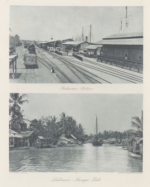 Carl J. Kleingrothe created this print, "Petroleuminstallaties met haven in Rantaupanjang," employing a technique that captures two distinct views with remarkable clarity. The structure is divided horizontally, offering contrasting perspectives of the same industrial landscape. In the upper image, the composition is dominated by the harbor, with a busy wharf and a body of water reflecting the sky. The lower image presents an expansive field leading to buildings, possibly residential or administrative, offering a stark contrast to the industrial activity above. Kleingrothe uses linear perspective to guide the viewer's eye, creating depth and scale within each scene. The monochromatic palette enhances the documentary feel, typical of the period, focusing on the industrial development in Rantaupanjang. The division of the print into two distinct scenes allows for a comparative reading, highlighting the multifaceted nature of the petroleum operations. This work serves as a historical document and invites reflection on the themes of industrialization, spatial organization, and the interplay between industry and nature.