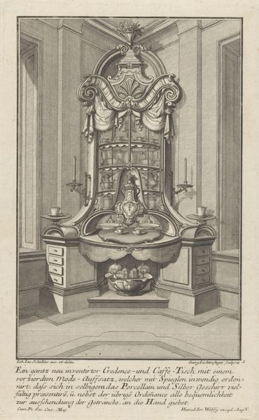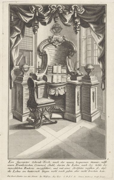 Editor: Here we have Johann Balthasar Probst's "Schrijftafel naast ramen," a print from the early 18th century. I'm struck by how ornate the writing desk is; it dominates the composition with its complex, almost theatrical structure. What strikes you most about this engraving? Curator: Indeed. A formalist approach leads us to observe that Probst's strategic use of line weight and density creates visual interest and conveys depth. The subject’s location near windows suggests that its very structure relies on ambient light in the overall visual and architectural scheme of things. The textures conveyed—the smooth surfaces versus the fabric folds—underscore material contrasts and suggest the skill of the artisan responsible for it's making. It invites consideration of semiotic play within Baroque conventions, would you agree? Editor: Definitely! It's interesting how the rigid lines of the desk contrast with the softer, almost draped appearance of the canopy above. But I wonder, is that enough to suggest its purpose? It's more than mere ornamentation. Curator: Precisely. Observe how the vertical lines, originating from the geometric base and culminating in the complex carvings overhead, suggest an upward movement, perhaps representative of Baroque's fondness for hierarchy. Consider that the artist uses framing in several places within the overall image; note in particular how each use leads our eyes to consider their role in the creation of both interior and exterior "realities." These elements help one move between simple aesthetics and something deeper, wouldn't you say? Editor: Yes, absolutely! I hadn't considered how the vertical lines contribute to this sense of Baroque grandeur, yet function in framing in the purest sense. Now I can better appreciate the artist's choices in line and form beyond mere representation. Curator: Then the artwork has communicated effectively through its intrinsic elements. That is the mark of its genius!