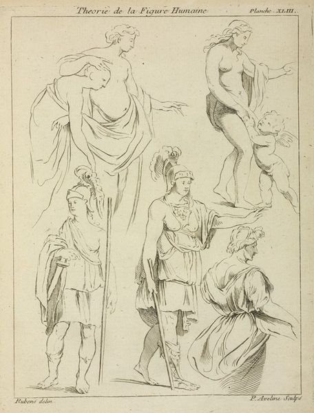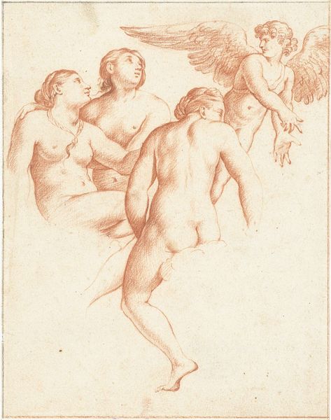 Curator: Here we have "Studies of standing female nudes and a pair of feet," a drawing attributed to Peter Paul Rubens. Look at how he captures the human form! Editor: It's like glancing over the shoulder of an artist practicing. A workshop snapshot. Makes me think about the intimacy of creation—the artist alone, wrestling with line and form. Curator: Exactly. These weren't meant for display as finished pieces, of course. Think of them as raw material for his more monumental works. The paper itself is interesting too. See the laid lines? Likely handmade, quite costly for the period. Editor: Costly, yes, but so incredibly vulnerable! I mean, look at those delicate ink strokes. It feels precarious, like a strong breeze could erase it all. Which adds a certain fragility, doesn’t it? To imagine a grand, baroque painting springing from something so fleeting… Curator: Speaking of baroque, we have to think about the cultural context here. Rubens’s nudes weren’t just about representing the body; they were about power, sensuality, and idealised beauty, intended for consumption by wealthy patrons who very likely collected drawings such as these. Editor: Sure, but they are not mere blueprints for production. It’s like the man simply loved painting flesh! You can see that passion bleeding through these academic studies. Do you ever wonder what his models thought about posing, or the working conditions in his studio at the time? Curator: That's a great point. We have limited primary source information detailing labor practices. The historical record often overlooks those voices, or we see women depicted through a biased, masculine lens, so we must be aware of our own limitations in reconstructing a more complex narrative. Editor: Well, putting all historical context aside, what remains is beauty. A sketch can deliver us to a deeper dimension beyond its original setting, inviting imagination. It reminds me of those times in life that were hard but beautiful too. Curator: A compelling observation. The piece underscores art's enduring ability to ignite emotional reflection across time. Editor: And, ultimately, to encourage dialogue, isn’t it? About beauty, labor, creation, and our ever-evolving understanding of each.