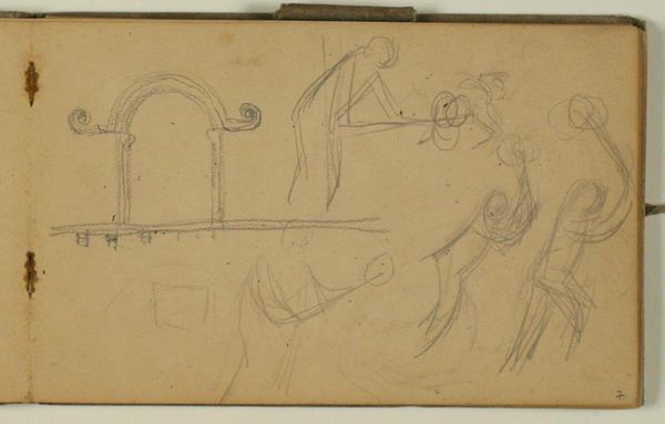 Editor: This is "Græsk (?) relief," a pencil drawing created in 1896 by Niels Larsen Stevns, currently residing in the SMK, the National Gallery of Denmark. I'm struck by the figure's fluid form, especially how the artist captures a sense of reclining weightiness with such minimal linework. What are your observations? Curator: Indeed. Note the artist's strategic use of line weight, modulating thickness to suggest both form and shadow. Observe how the contour lines defining the figure’s back and limbs are more pronounced than those delineating the chest or abdomen, implying a light source emanating from above and to the left. Editor: That makes the sketch more 3D, yes. What about its being labelled as "Greek"? Does it relate to classical Greek sculpture in its construction, its formalism? Curator: Arguably. While rendered in a comparatively loose, almost gestural style, we discern a distinct echo of classical contrapposto in the figure’s posture. Observe the subtle shift in weight, the slight twist of the torso—these are all hallmarks of classical sculpture that prioritize a balance between tension and relaxation within the human form. Editor: I see it now. But what about the rectangle drawn around the figures? What do we make of this conscious compositional act? Curator: The rectangle introduces a fascinating element of spatial tension, wouldn’t you agree? Rather than seamlessly integrating the figure with its environment, it actively compartmentalizes it, framing it as an object of study, like an inscription on a manuscript, perhaps or a specimen awaiting classification. It foregrounds the artwork as "art" in ways more open presentation does not. Editor: That's insightful. Thank you. I would not have caught these intricacies on my own. Curator: Of course. Close scrutiny of form is the key. Only then does structure unveil its hidden layers of intention.