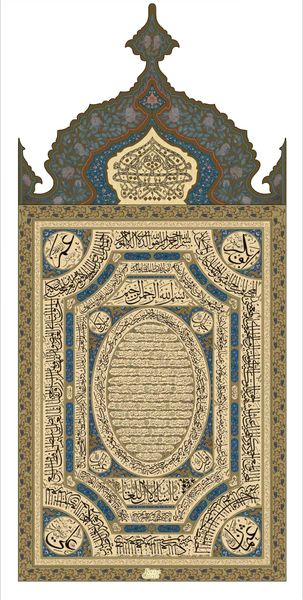 Editor: Here we have the Inscribed Banner, dating roughly from 1670 to 1721, created by Isma'il Kashani. It's crafted from silk, so, a textile piece. The banner has this unique triangular shape filled with intricate patterns and calligraphy. It strikes me as incredibly decorative, almost overwhelming in its detail. What do you make of its overall composition? Curator: Indeed, its triangular format immediately compels us to consider the implied lines and the direction of the gaze it constructs. Note how the calligraphy dominates, a complex interplay of forms asserting its visual authority. The organic patterns surrounding it serve as a textural counterpoint. Do you observe any particular rhythms or repetitions in those surrounding floral arabesques? Editor: I do notice how the pink floral pattern seems to echo some of the curved lines within the script, as if there's an attempt to create harmony through repeated shapes. But the script itself almost looks woven, not just painted on, but integrated into the material. Is this just the effect of how meticulously it has been made? Curator: Precisely. The very act of inscribing upon silk introduces a tension. The silk’s inherent fragility clashes with the permanence implied by the inscription. The script is paramount here and dictates every spatial configuration on the triangular form. It guides how we look at the surface, from large shapes to tiny features. What feeling emanates from the density of these overlaid structures? Editor: It's imposing, really. A bit intimidating, even. All of that interwoven forms command attention. I find the use of gold for the main inscription especially compelling. Curator: It signifies value, certainly, adding weight to the words but notice how all those colors— blues, reds, golds, and greens—exist independently from each other and are placed very thoughtfully within this artwork. This isn't merely decoration. Each formal element contributes to a sophisticated whole. Editor: I'm starting to appreciate how it all contributes to a holistic artistic statement, one of considered aesthetic intention. The use of different colors and organic shapes work in conjunction with the inscriptions, making this far more sophisticated than initially seems.