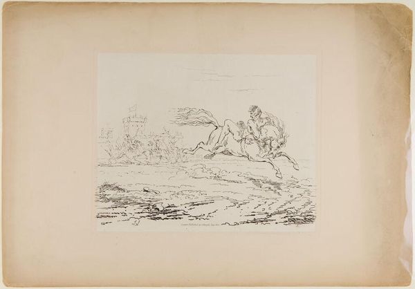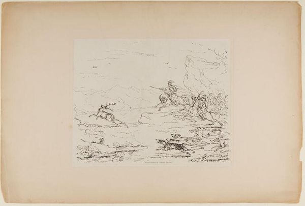 Curator: This intriguing line drawing from the Harvard Art Museums is entitled *A Mounted Knight Leading an Army and Fording a River*, attributed to Sir John James Stuart Bart. Editor: It strikes me as both delicate and powerful. The scale is intimate, yet the energy of the scene feels vast, as though hinting at larger conflicts. Curator: Indeed. Notice how the knight, with his pointed lance, becomes a symbol of leadership and forward momentum. The river, however, might also signify a boundary, a challenge overcome. Editor: I can't help but think about how such imagery has historically served to legitimize power structures and narratives of domination. Who gets to be the hero in these stories, and at whose expense? Curator: The symbolic weight of the mounted knight is certainly complex. He embodies bravery and authority, but also perhaps conquest and the imposition of will. It's a trope repeated throughout Western visual culture. Editor: It makes you question whether we've truly moved past these romanticized portrayals of conflict and leadership. Curator: A drawing like this reminds us that these images are not neutral; they carry with them a whole history of cultural and political baggage. Editor: Exactly. Art invites us to unpack that baggage, to challenge and re-evaluate what these symbols mean to us today.