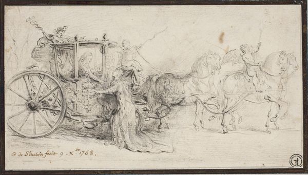 This pen and brown ink drawing, titled ‘Zwei furagierende Reiter mit drei Pferden’, was created by Georg Philipp Rugendas in 1697, and is held at the Städel Museum. Here we see a somewhat informal grouping of horses, riders, and figures in a landscape. Rugendas employs a hatching technique to delineate forms and to create a sense of depth, allowing light to define the shapes. The composition isn't symmetrical. The figures and horses create movement across the page with a dynamic interplay of lines and forms. The use of line is particularly striking. Rugendas’ light, quick strokes build up the figures and landscape, implying movement and energy. Semiotically, this use of the pen can be seen as more than descriptive. It reflects a broader interest in dynamism and the fleeting moment, ideas that began to challenge established notions of static representation in the late 17th century. This drawing presents an idea of art as process, emphasizing the act of seeing and recording rather than creating a perfectly polished image.