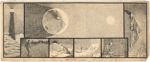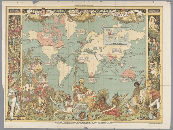 This is Frederick de Wit's 'Frontispiece', a colored engraving on laid paper. Visually, the 'Frontispiece' offers a world held in precarious balance. Atlas, the mythological titan, shoulders a globe under a twilight sky. The work balances light and shadow, with the radiant lines of sunrise sharply contrasted against the shadowed continents and the somber lunar glow. De Wit's composition invites a semiotic reading, where Atlas is not merely a figure from myth, but a signifier of the burden of knowledge. The globe itself, meticulously detailed, represents the known world, and the red lines symbolize the routes of discovery and trade. The positioning of Atlas, straining under his load, might be interpreted as an allegory of the era's intellectual tensions, where new discoveries challenged old certainties. Consider how the formal elements – the strong lines, the weight of the figure, and the contrast between darkness and light – function to convey themes of exploration, the weight of knowledge, and the human ambition to map and understand the world. The work remains a testament to the dynamic interplay between art, science, and philosophy.