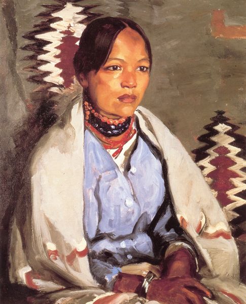 Robert Henri made this portrait of a young man of the Tesuque Pueblo using oil paint, and you can really see his process. It's all about the brushstrokes! Look how they build up the form, especially around the face. The colors are muted, earthy, and warm, except for that striking red blanket, with its amazing zig-zagging black border. Those bold, angular shapes offer a counterpoint to the smooth modeling of the face, and draw your eye down the canvas. The brushstrokes are confident and loose. Henri's work reminds me of other painters, like Alice Neel. Like Neel, there is something powerful and affecting in his simple and direct style, showing us the poetry and dignity of everyday life. Ultimately, this painting invites us to think about how we see each other, and how we connect.