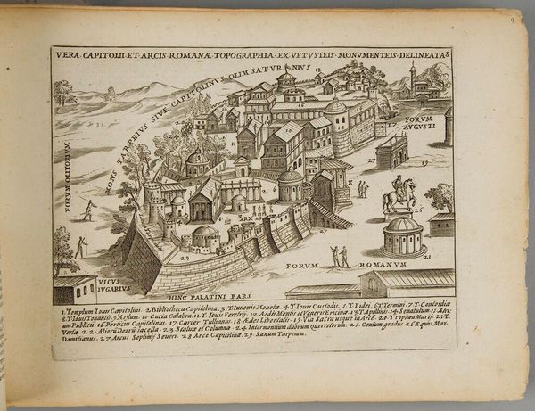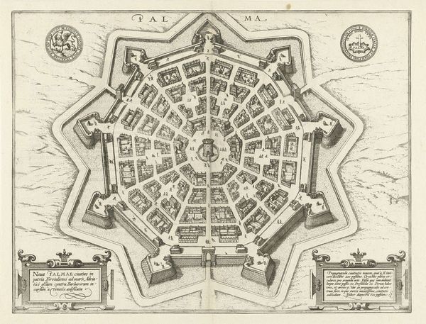 Editor: This is Hans Holbein the Younger's "Ezekiel XLVII," a fascinating architectural rendering. It feels like a map, but the labels are unexpected: tribe names and cardinal directions. What do you see in this piece? Curator: It's a symbolic vision, isn't it? The walled city, precisely ordered, evokes a longing for spiritual and societal harmony. The names point to a yearning for a return to ancestral lands, a potent symbol of cultural identity and continuity. Editor: So, the city isn't necessarily a place, but an idea? Curator: Precisely. And consider the dome in the center, a focal point that suggests a sacred space. What emotions does the overall composition evoke in you? Editor: A sense of hope, maybe? Like a blueprint for a better world. Curator: Indeed. Holbein masterfully uses familiar symbols to express complex cultural and psychological desires. We see how deeply rooted these images are.