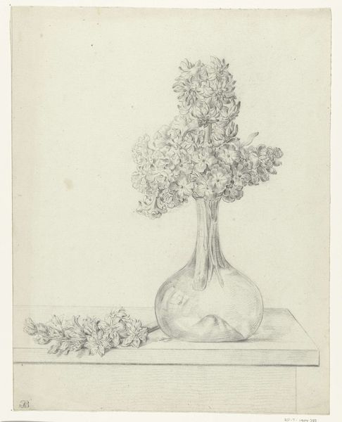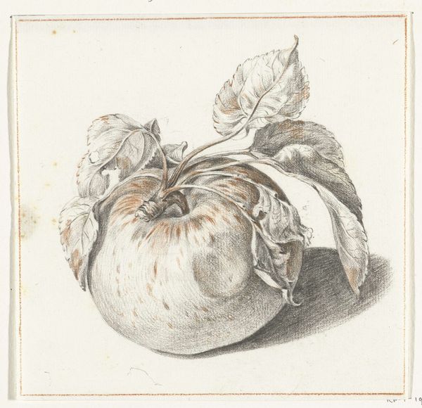 Anton Weiss created this drawing of an apple sometime in the first half of the 19th century, and it is now held in the Rijksmuseum. The drawing captivates with its understated elegance, a testament to the power of simplicity in form and composition. The apple, rendered in graphite, sits just off-center, nestled amongst a few leaves. Weiss's formalism directs our attention to the apple's smooth, round surface. Notice how the light gently caresses the fruit, creating soft gradations that hint at its volume. The leaves, detailed with delicate lines, offer a subtle contrast in texture. This isn't merely a depiction of fruit; it’s an exercise in observing the interplay between light and shadow, form and space. The drawing's appeal lies in its capacity to invite contemplation on the beauty inherent in the everyday. Through his formal choices, Weiss elevates a simple object into a study of nature's inherent order and visual harmony.