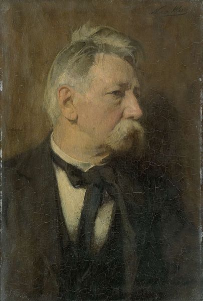 Curator: Anders Zorn painted this portrait of Joseph Randolph Coolidge in 1899. Look at the thoughtful pose, the man is resting his face on his hand. Editor: I’m struck by the somber mood. The limited palette and indistinct background make the portrait feel intimate, almost melancholic. Curator: Zorn was a master of capturing the character of his sitters, often from positions of power and influence, like Coolidge, a prominent Bostonian. How do you think the portrait reflects that? Editor: His gaze seems to acknowledge the weight of responsibility, the pose suggesting both contemplation and perhaps a weariness associated with his position. The composition really lends itself to that reading. Curator: Absolutely. And I'm curious, what does Coolidge's expression say about societal expectations surrounding masculinity and leadership during that era? Editor: It raises questions about the emotional lives of men in positions of power, and how art can both reflect and subvert those expectations. Curator: It is fascinating how Zorn captured Coolidge and I appreciate how this image continues to spark contemporary dialogues on identity and power. Editor: Indeed. It's a reminder of art's enduring ability to prompt introspection about ourselves.