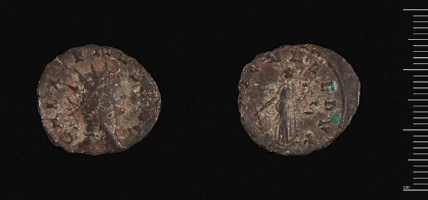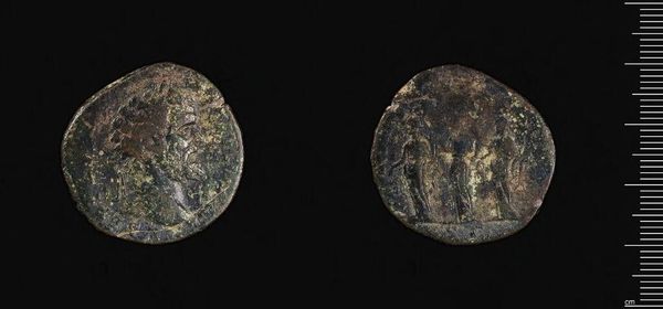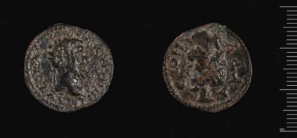Editor: Here we have a bronze coin of Germe, Mysia, dating back to the reign of Severus Alexander. Its worn texture gives it a tangible sense of history. What do you observe in its composition? Curator: The coin's circular form and the raised relief of the figures create a compelling interplay of positive and negative space. Notice the way the artist utilizes line to define the imperial portrait on one side and the figural scene on the other. The patina, the chemical alteration of the surface, while obscuring detail, also contributes to its overall visual impact. Editor: It’s remarkable how those simple formal choices convey so much. Thank you. Curator: Indeed, it prompts further consideration of the coin's materiality as both medium and message.