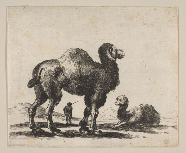 Editor: Here we have "Plate 15: doe, from 'Various animals'," dating from between 1641 and 1660. It’s an etching, and while anonymous, the landscape style makes me think of the Baroque era. It has this quiet, almost melancholic feel. What do you see in it? Curator: Formally, it’s quite compelling. Notice the artist's use of line. The etching technique allows for fine, controlled strokes that define the animal’s form, yet also a looser, more expressive quality in the background landscape. Observe the contrasts. The texture of the doe's fur is implied through varied densities of etched lines, compared to the smoother, less detailed sky. How does that affect your perception? Editor: It’s interesting that you point that out. It makes the doe the definite focal point, while still placing her in an environment that does have some weight. I mean, look at those rock formations. Curator: Precisely. There is a clear hierarchy established by the manipulation of visual elements. We might also analyze the composition, noting how the placement of the doe nearly center frame and angled towards the left creates a dynamic tension. Where does your eye travel? Editor: I start with the doe's eye and then my gaze is pulled towards the landscape on the left side. It really makes you examine all the elements that make up the piece. What about the use of shading? Curator: The shading creates depth and volume, modeling the form of the doe and grounding her within the scene. But the etching also lacks deep blacks, creating a more tonal and delicate aesthetic overall, emphasizing the two-dimensional surface of the paper, defying illusionism and redirecting one's attention to the artifice of art. Editor: That’s fascinating. I never would have thought about the emphasis on the paper itself as part of the composition. Curator: Attending to the artist's material choices allows us entry to deeper meaning, always. Editor: I’ve definitely learned something new about reading images. Thanks for sharing your insights.