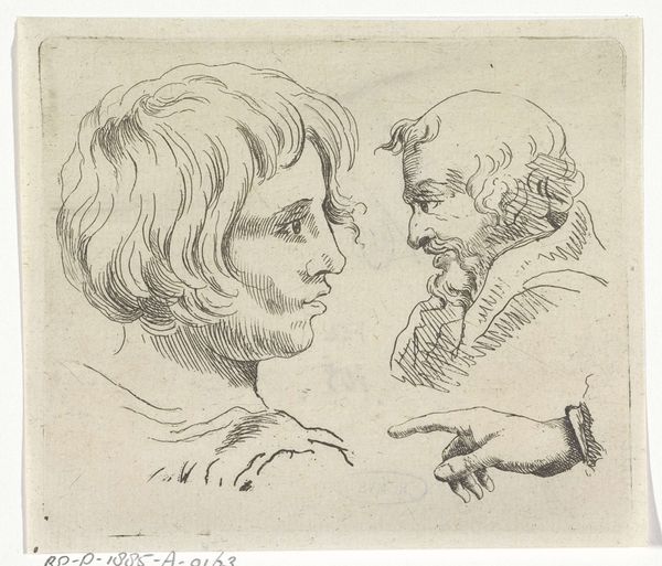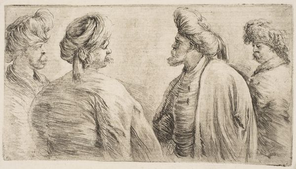 This study sheet with a woman's bust and three women's heads was made by Gerrit Lamberts using etching, a printmaking technique. The etcher covers a metal plate with a waxy, acid-resistant ground. Then, using a sharp needle, the artist scratches lines through the ground, exposing the metal. The plate is immersed in acid, which bites into the exposed lines, creating grooves. The ground is removed, ink is applied to the plate, filling the grooves, and the surface is wiped clean. Finally, damp paper is pressed against the plate, transferring the ink and creating the print. The etched lines of this work, with their varying thicknesses and densities, create a range of tones and textures, giving the figures depth and form. The process allows for a level of detail that captures the subtle nuances of the women's faces and clothing. By understanding this detailed, labor-intensive printmaking process, we can appreciate the skill and artistry involved in creating this study sheet, blurring the lines between craft and fine art.