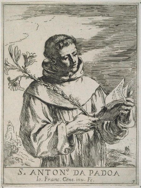 Editor: This etching, Saint Anthony of Padua by Guercino, dates to the 1630s and what strikes me is the way light falls across his face, it's quite dramatic. What do you see in this piece? Curator: Well, consider the lily he holds. Its purity is a strong visual metaphor for Anthony’s own reputation for chastity and virtue. The lily speaks volumes. It links to narratives of innocence and divine blessing, consistently used to convey those ideas through art. Editor: So the lily isn't just a pretty flower, it’s loaded with meaning? Curator: Exactly. And notice how Anthony is also holding a book, presumably scripture, symbolizing his role as a Doctor of the Church. But think also, the very *act* of reading represented in visual form indicates intellectualism and devotion – incredibly powerful, socially. Have you observed other recurring objects connected with Anthony's imagery? Editor: Now that you mention it, he often has a child with him. Curator: Indeed. He had a profound connection with children – a symbol of the soul, of purity, but also the Church's future. This echoes larger ideas present across Baroque portraiture but localized to Anthony's known reputation. The image itself functions like a prayer, invoking specific spiritual ideas to trigger emotional responses. Editor: That really sheds light on how much symbolism is packed into a single image, going beyond just a portrait! Curator: Precisely. It reveals how a simple image can echo through collective memory and spiritual beliefs, even centuries later.