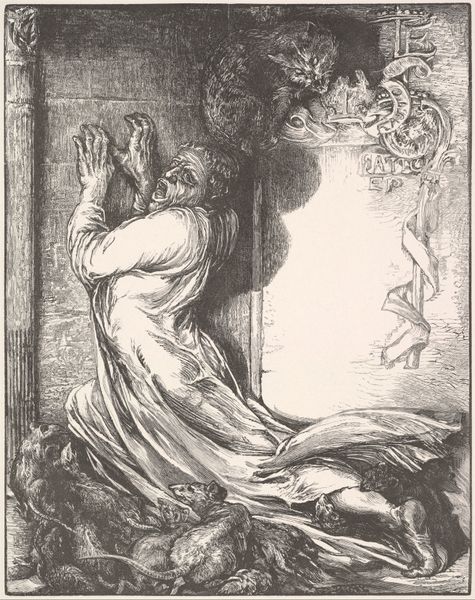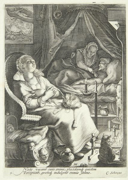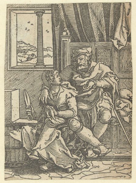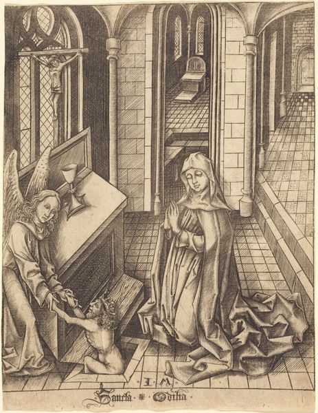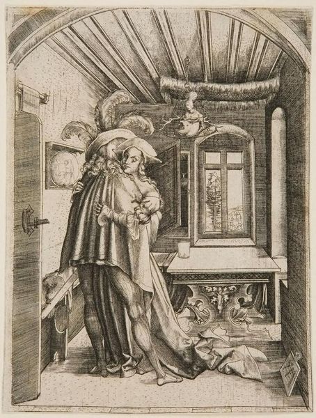 Curator: Welcome. We are standing before an engraving titled “The Embrace,” crafted by the artist known only as Monogrammist MZ, sometime between 1490 and 1510. Editor: It strikes me immediately as a claustrophobic scene. The stark black lines amplify that sensation, don’t you think? And there is a certain tension between the two figures even as they embrace, like their connection is both desired and perhaps dangerous. Curator: Note the intricate textures achieved through the engraving technique. Observe the detailing in the garments—the folds, the feathers—each carefully rendered to create a sense of depth and opulence. We can easily distinguish various material qualities due to how each surface reflects light. Editor: The room they occupy isn’t merely background; it speaks volumes. Look at the object placed above the window, what is its meaning? And is this embrace truly consensual when observed in a room like this? Surely economic and class differences played a role in such encounters during the Renaissance. It forces us to consider themes of desire, power, and the very act of looking, doesn’t it? Curator: Let’s consider the composition itself. The figures are placed asymmetrically, creating a visual tension that propels the viewer’s eye around the picture plane. The textures throughout the scene and architecture contribute to its formal intricacy. There is an almost mathematical structure that determines the form. Editor: Yes, a structured imbalance that reflects perhaps a society similarly off-kilter. This image offers such rich commentary about the status of people and things, and how moral concepts were experienced then and now. I am glad this narrative moment has been preserved. Curator: And that this artist has given us this snapshot that still generates thoughts today. Editor: Absolutely.